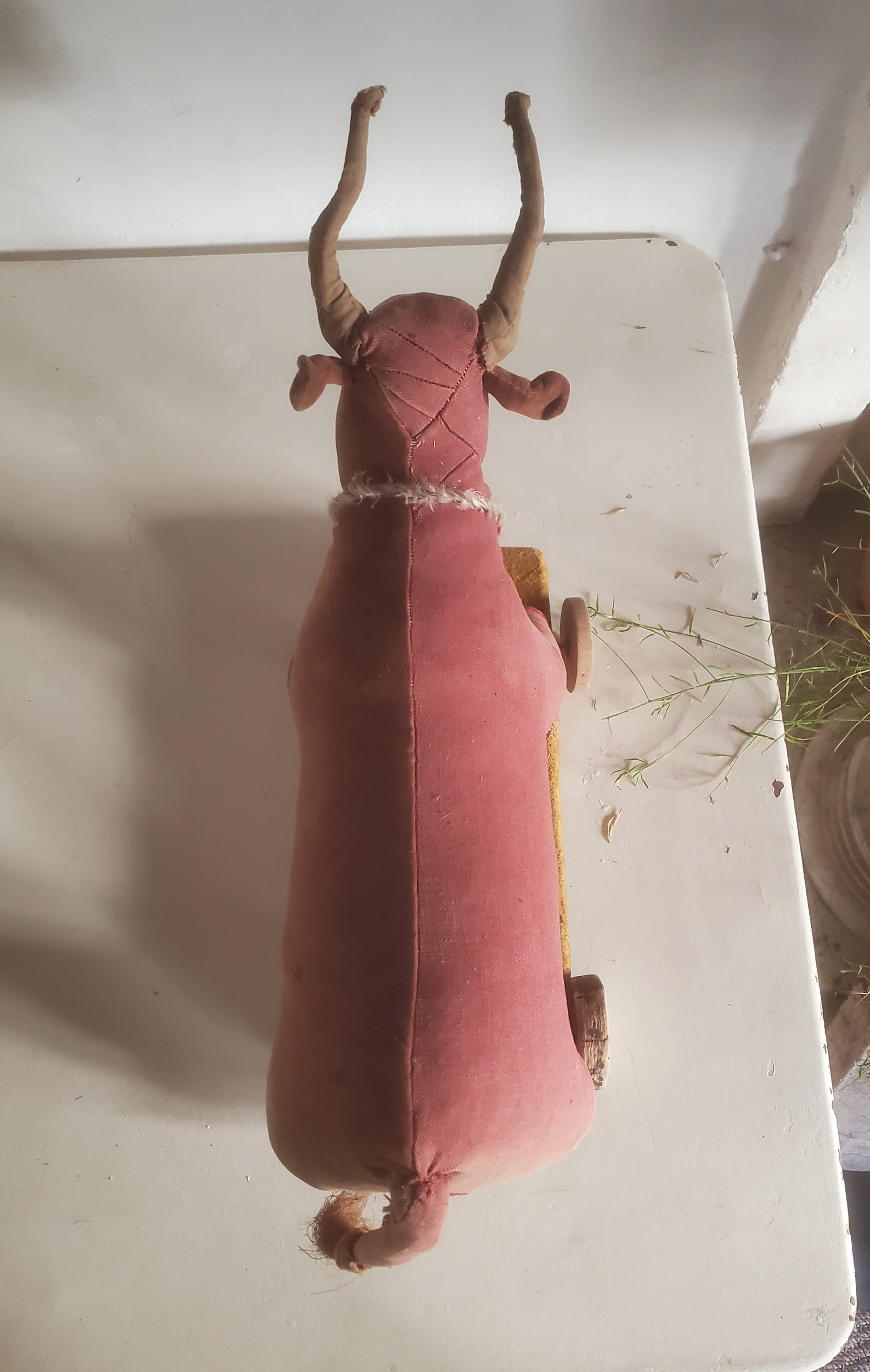 Incroyable jouet fabriqué à la main et représentant une vache sur roulettes crée pour un enfant. Cette vache est entièrement constituée de tissus aux couleurs framboise et beige avec une garniture à l'ancienne (fibres de coton ?), les yeux sont des vieux boutons. Les coutures sont anciennes. Le socle sur lequel est fixé la vache est en bois recouvert de velours couleur moutarde. Les roulettes sont dépareillées (une paire en bois et l'autre en liège) ce qui explique que la vache ne peut plus se déplacer ni rouler ( il y a un anneau devant qui servait à la tirer par une cordelette pour l'enfant).