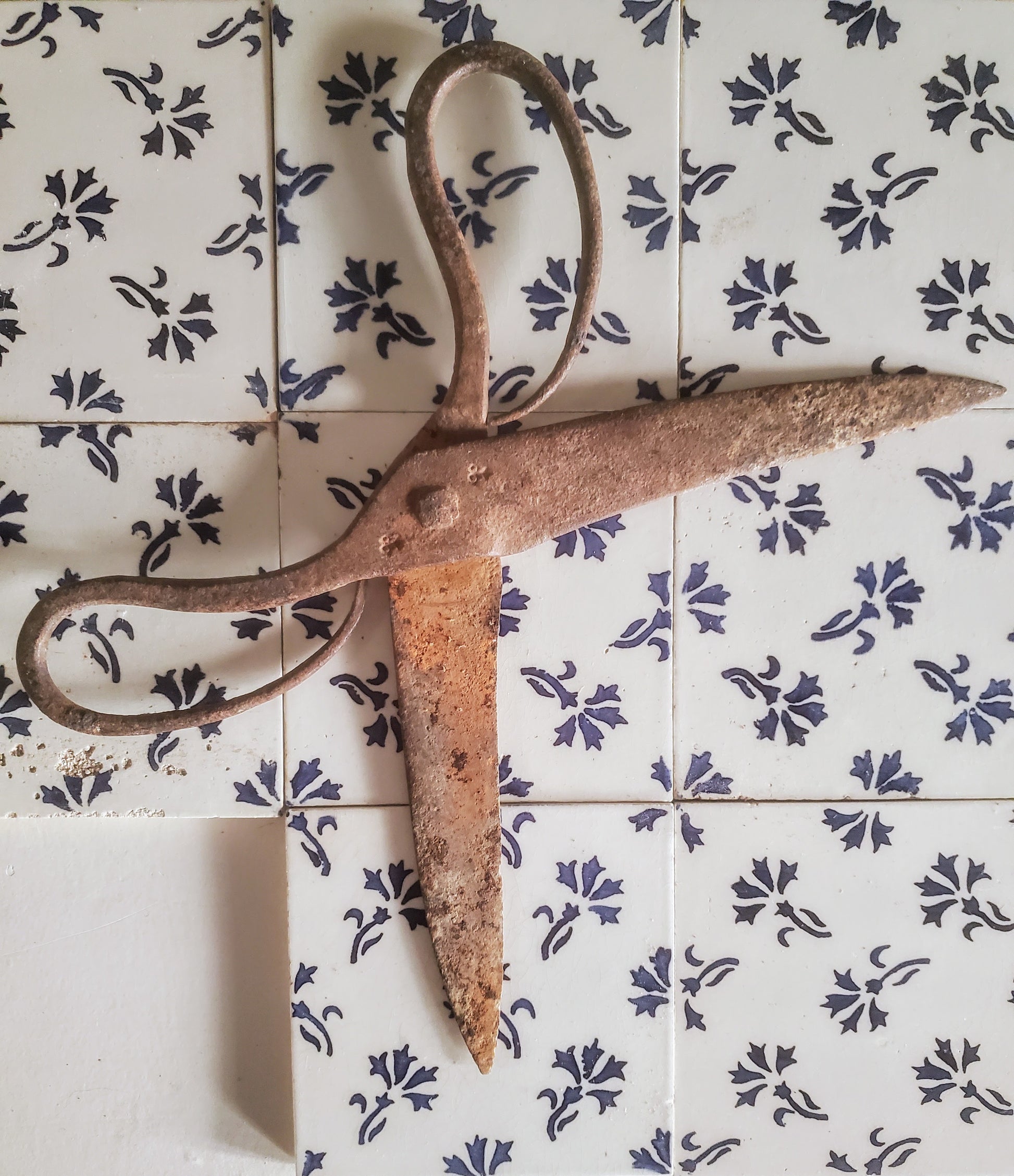 Authentique paire de vieux ciseaux, forgée à la main, certainement datant du début XIX -ème siècle, longues lames de 15,5 cm ( longueur des poignées 10 cm).